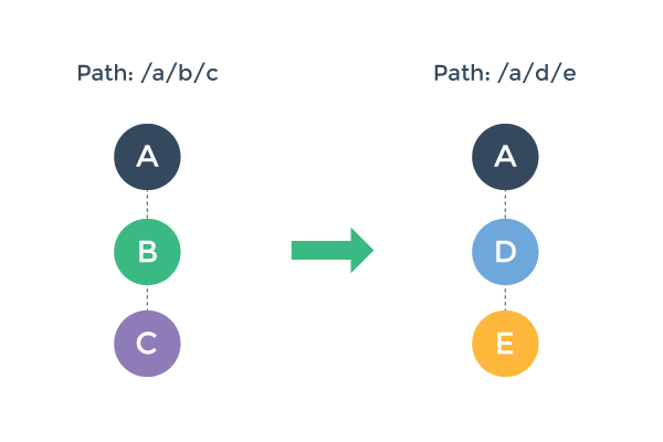And then, the user navigates to a new path, /a/d/e, which requires us to update our rendered component tree to a new one: